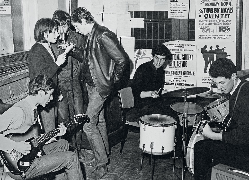 Группа Sigma 6 в студенческой гостиной в политехе на Риджент-стрит, где мы репетировали. Слева направо: Клайв Меткаф, Шейла Ноубл, Кит Ноубл, Роджер, я и гитарист, которого прежде не удавалось опознать, однако теперь я счастлив сообщить, что это Вернон Томпсон. Я уже дорос до барабанной установки Premier.