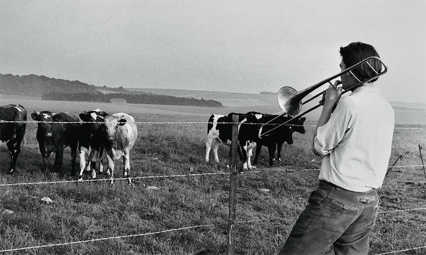 Рик со своим тромбоном исполняет серенады для отзывчивой коровьей аудитории поблизости от Стоунхенджа, нечаянно предвосхищая дизайн конверта «Atom Heart Mother»…
