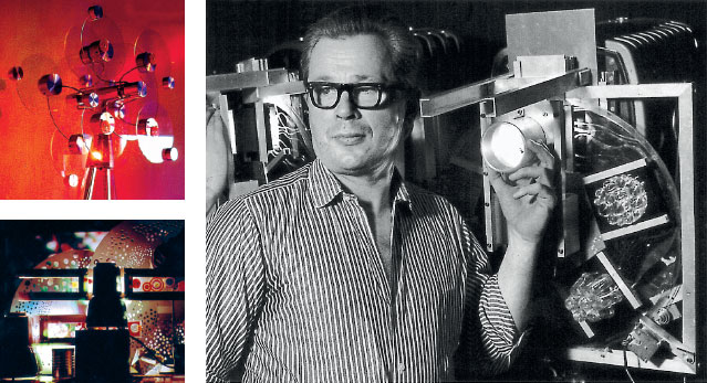 Майк Леонард с одной из проекционных машин. Их он создавал вместе со своей командой в Школе искусств в Хорнси (на следующем фото Роджер ассистирует). В машинах использовались стеклянные или перфорированные металлические диски с плексигласовыми элементами – диски вращались при помощи электромоторов и проецировали на стену световые узоры. В одном эпизоде «Завтрашнего мира» отважно предсказывали, что к 1970-м подобным проектором будет оснащена каждая гостиная в стране.
