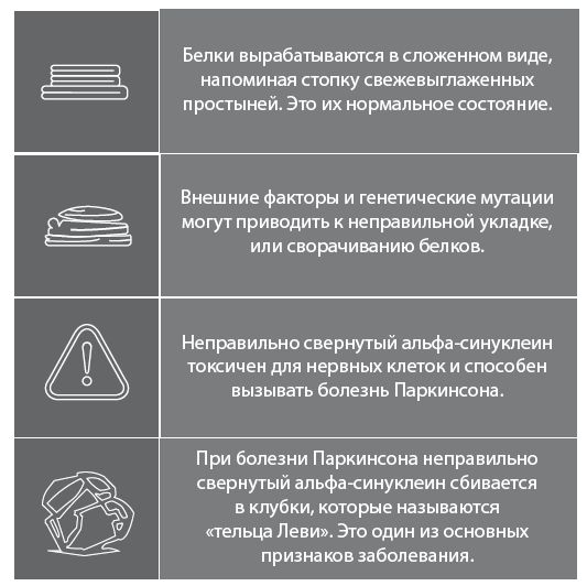 Белки вырабатываются в сложенном состоянии, напоминая стопку свежевыглаженных простыней. Однако мутации, обнаруженные в средиземноморских семьях, привели к изменению формы и последующей неправильной укладке или сворачиванию альфа-синуклеина. Иными словами, наша аккуратная стопка белья превратилась в кучу малу, и в результате развилась болезнь Паркинсона (69).