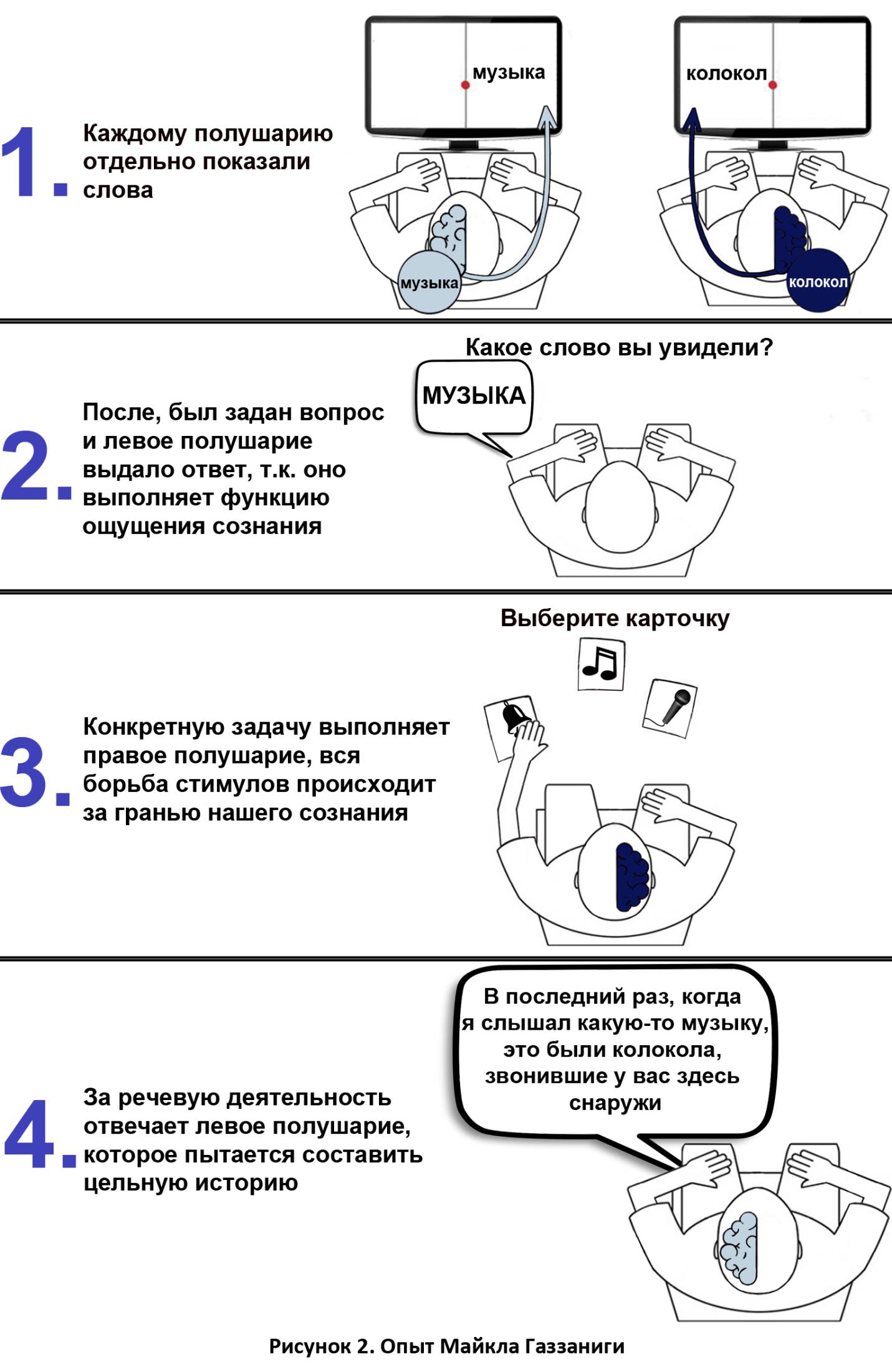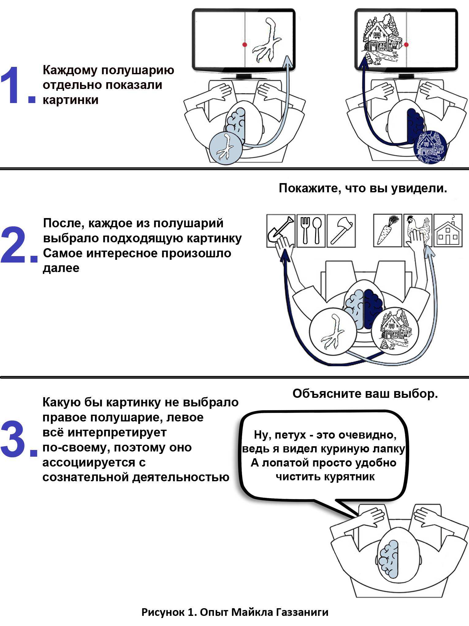 Если вы спросите: «А в чём усложнение?». Как раз таки в вопросе после: «Почему вы указали на лопату?». Левое полушарие придумало целую историю, что лопата нужна для чистки курятника. У больных эпилепсией с разделённым мозгом (это уточнение забывают, когда описывают эксперименты) каждое полушарие работает независимо (Рисунок 1).