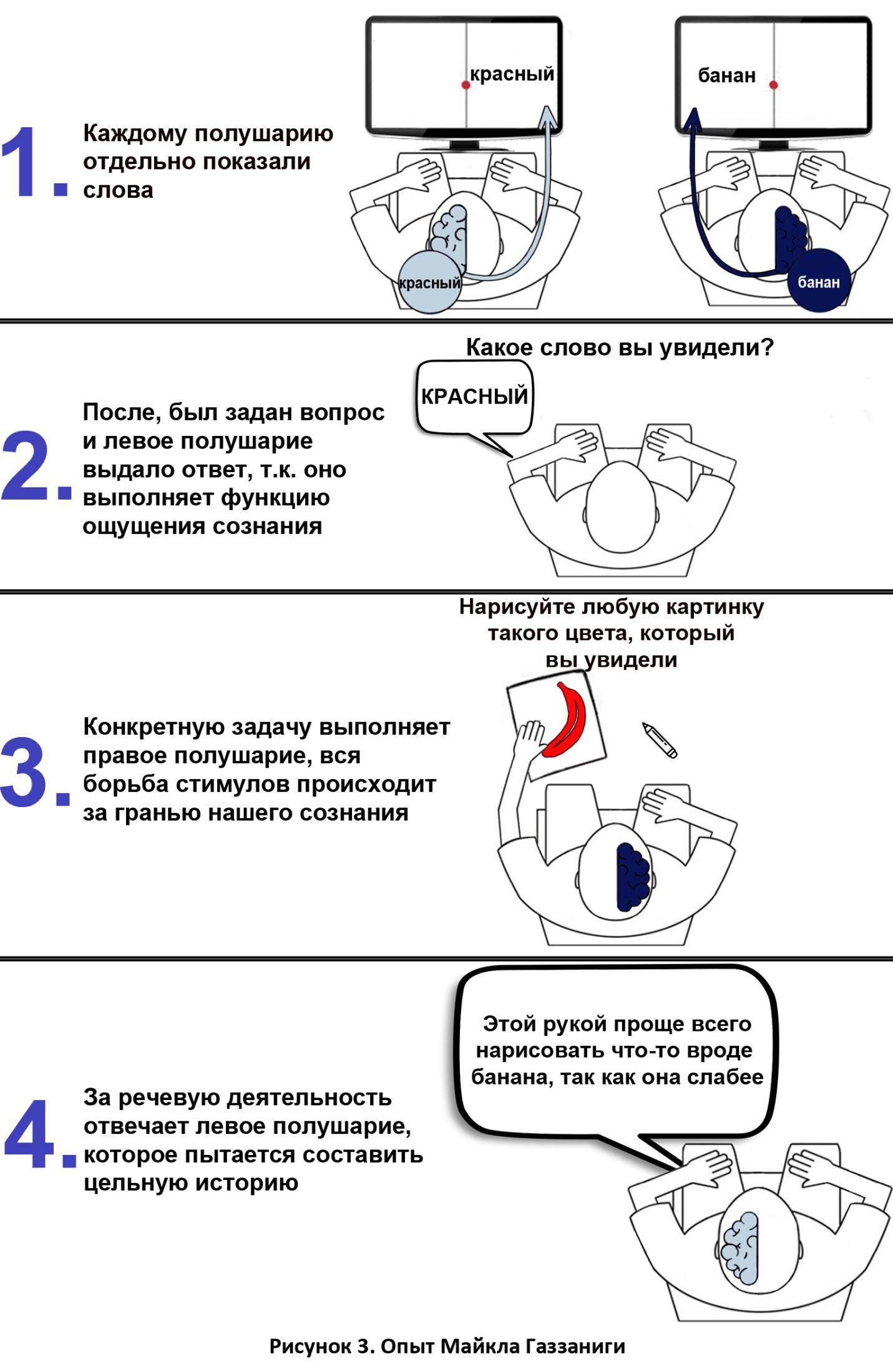 Одна из моих любимых книг «Кто за главного!?» от Майкла Газзаниги, в ней исследователь планомерно и системно описывает те выводы, которые он сделал из результатов бесчисленных экспериментов. Вот еще парочка из них (Рисунок 2 и 3). Они чуть лучше описывают механизм, поскольку испытуемым показывали вместо картинок – слова.