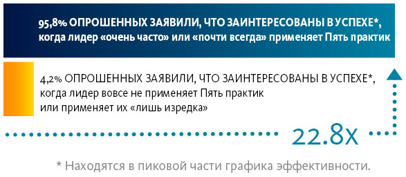 Практически 96 % респондентов, заявивших, что они заинтересованы в успехе (то есть находятся в верхней части графика), указывают, что их лидеры часто или всегда применяют Пять практик. Среди тех, чьи лидеры применяют практики изредка или никогда, заинтересованных в успехе оказалось менее 5 %. Разрыв просто огромный.