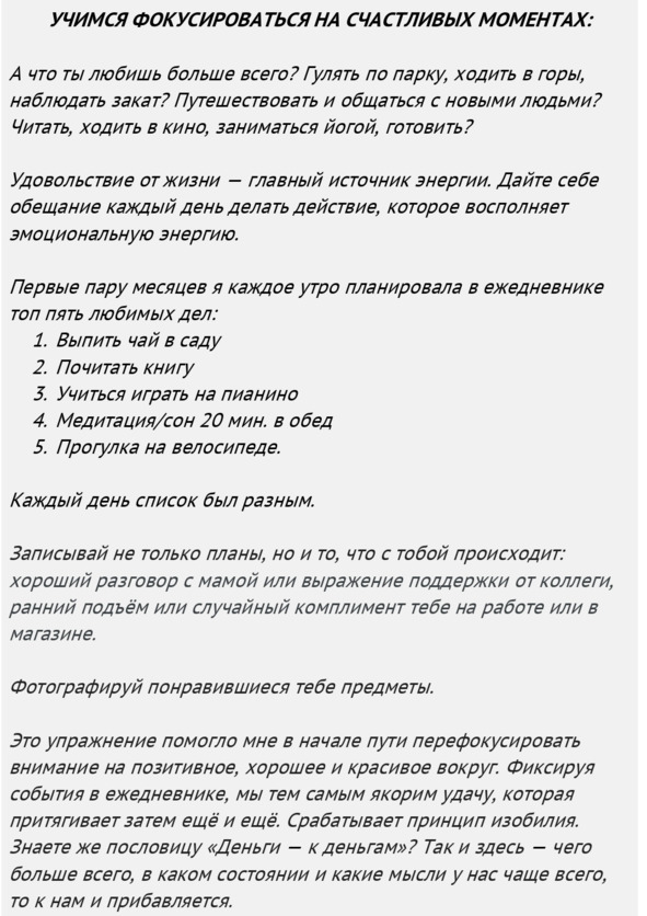 Эти маленькие ритуалы помогут тебе со временем повысить настроение и увидеть, что в твоей жизни есть очень много хорошего. Даже в обычном дне и какой-то непростой ситуации есть всегда что-то позитивное, что наполняет тебя радостью, благодарностью и энергией.