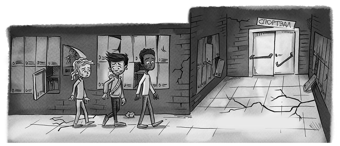 Сэм почувствовал дрожь под ногами. По отполированному деревянному полу спортзала побежали маленькие трещины. Мальчик поднял взгляд и увидел, что потолок треснул надвое! Сэм обернулся предупредить Люси и Антонио, но те уже бежали через зал!