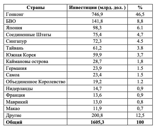 Табл. 2. 15 крупнейших инвесторов в Китае на конец 2014 г.
