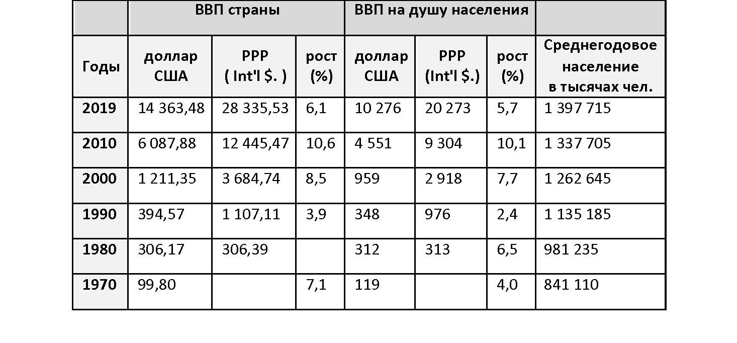 Tab. 3. Dynamics of China's economic indicators for the period 1970 – 2019. (Indicators of the country's GDP – Indicator of GDP/person.) [26]