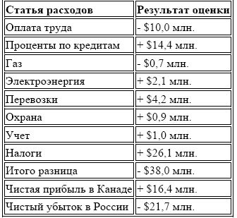 Если анализировать статьи, расходы по которым в России выше, чем в Канаде, можно заметить, что около 30 % ($14,4 млн.) составляет превышение выплат процентов по кредитам и 53,6 % ($26,1 млн.) – превышение налоговой нагрузки.