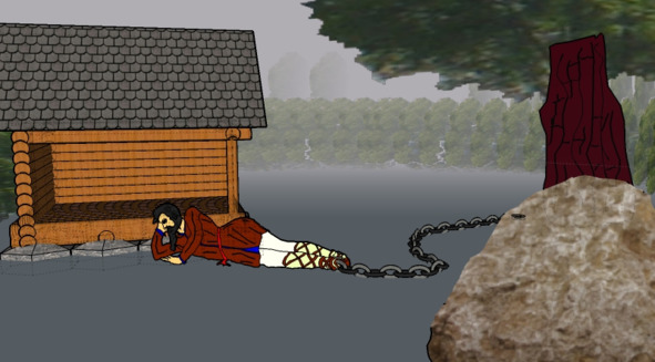 На поляне рос высокий толстый дуб. Почти рядом с ним стояла невысокая хижина из толстых бревен. С этого места они видели только две стены этой хижины. Ни окон, ни дверей на этих стенах, не было. К дереву одним концом была привязана толстая железная цепь. Другой конец цепи уходил куда-то за хижину. Вокруг поляны росли колючие кусты и только там, где стояли ребята, их не было.