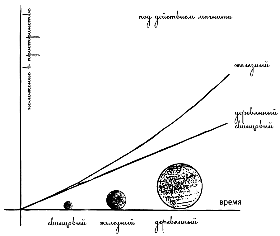 И наконец, как обстоит дело с силами? Есть силы, хорошо нам знакомые – например, сила, с которой человек толкает предмет, или же сила ветра, обдувающего тело. Другой известный пример – магнитные силы. Представьте себе, что вы держите огромный подковообразный магнит и подносите его к чугунному шару. Медленно, но верно чугунный шар под действием магнита покатится к вам. Если же вы поднесете два одинаковых магнита вместо одного, он покатится вдвое быстрее. А вот на деревянный шар ваш магнит не подействует. Такое впечатление, что магнитная сила, действующая на предмет, зависит от его внутренних свойств – в том числе от состава, от количества материала, из которого предмет состоит, и даже от его температуры. Это свойство можно назвать его магнитным зарядом.
