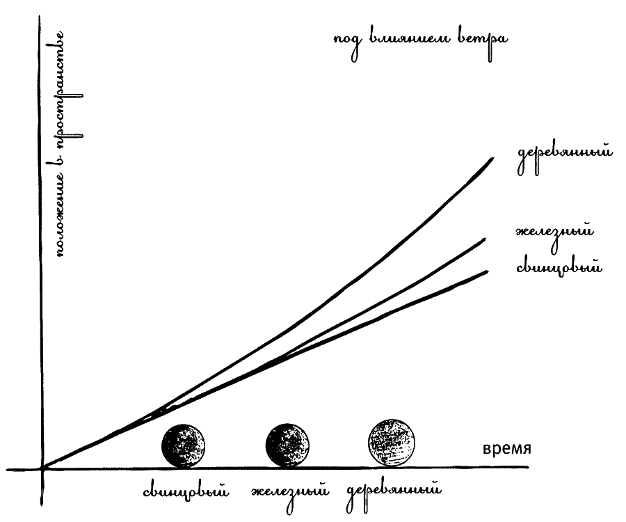 Эти концепции, хотя и довольно точные, в некотором смысле отличаются от их расхожих смыслов, поэтому ради прояснения их значений стоит проделать несколько мысленных экспериментов. Вообразите, например, что вы катите по земле очень большой деревянный шар, который под действием этой силы катится все быстрее и быстрее. Если теперь вы его отпустите, он будет какое-то время катиться с постоянной скоростью, пока другая сила, например, сила трения, не замедлит его движение[17]. Теперь вообразите, что вы точно так же толкнете чугунный шар того же размера. Если вы приложите то же усилие, чугунный шар будет катиться гораздо медленнее, чем деревянный. Действительно, его масса много больше, так что если приложить ту же силу, возникшее ускорение будет много меньше. Теперь допустим, что у вас есть двойник, который, видя ваши мучения с чугунным шаром, приходит вам на помощь. Вы вместе с двойником, прикладывая одинаковые усилия в течение того же времени, что и в предыдущем случае, можете заставить чугунный шар двигаться вдвое быстрее: вы удвоили силу, и, следовательно, ускорение тоже удвоилось.