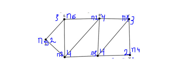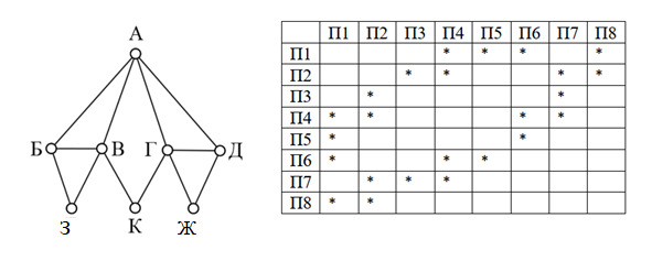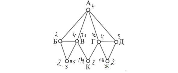Пункт К соединяется с вершинами Г (4 вершины) и В (4 вершины). П8 соединяется как раз с двумя вершинами П1 и П2, каждая из которых имеет по 4 дороги, значит, П8=К. Т. к. П8 соединяется с П1 и П2 имеет четыре вершины, то можно предположить, что П1=В, а П2=Г. П1 соединяется с П5, и т. к. П5 имеет 2 вершины, то П5=З. Ранее выяснили, что П2=Г и П2 пересекается с П3, которая имеет 2 вершины, значит, П3=Ж.