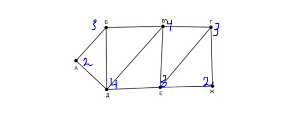 Им соответствует вершина А и Ж. Мы видим в таблице, что в П5 есть два пути. Поэтому предположим, что П5=А, тогда П4=Ж. Т. к. П5 пересекается в значении 10 с П6 и П6=3, то П6=Б. Аналогично получаем, что П7=Д. Далее П7 пересекается с П3, то П3=В. Т. к. П6 пересекается с П2, то П2=В, остается, что П3=Е. Осталась одна вершина – это П1=Г. Условие, что ВЕ> ВД, 23> 16. Это условие истинно, значит, наше предположение изначальное, что П5=А, а П4=Ж, а не наоборот – истинное. А если бы было ложное, тогда что? Тогда бы пришлось рисовать заново, предполагая, что П5=Ж, а П4=А. Смотрим по таблице пересечение П1 и П4 – это число 2.