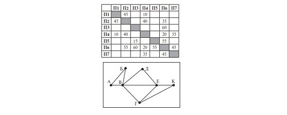На рисунке слева схема дорог Н-ского района изображена в виде графа, в таблице содержатся сведения о длинах этих дорог (в километрах). Так как таблицу и схему рисовали независимо друг от друга, то нумерация населённых пунктов в таблице никак не связана с буквенными обозначениями на графе.