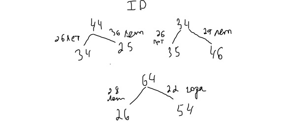 Нарисуем 3 дерева ниже, где матерями будут выступать женщины со следующими ID: 44, 34, 64. По рисунку ниже мы видим, что мать с ID= 44 родила в 26 и 36 лет, мать с ID=34 родила в 26 и 29 лет, а мать с ID=64 родила в 22 и 28 лет. Из чего можем сделать вывод, что 22 года – это самый младший возраст женщины, которая родила ребенка. Поэтому это мать с ID=64.