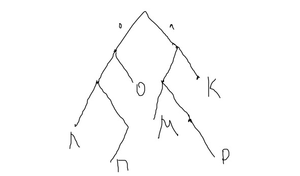 Изобразим буквы К, Л, П, Р на дереве (рекомендую на экзамене прямо так и рисовать мышкой, как у меня выше нарисовано). По условию задачи необходимо, чтобы слово не являлось началом другого кодового слово, т.к. необходимо, чтобы выполнялось прямое условие Фано. Необходимо поставить в дерево две буквы: О и М, чтобы условие Фано выполнялось. Как это сделать? Т.к. буква О в слове «молоко» встречается 3 раза, то мы поставим эту букву на меньшую глубину дерева (01), чтобы получить наименьший код. Букву М, которая встречается всего 1 раз, поставим на большую глубину дерева (100). Итого имеем следующие длины: М=100=3, О=01=2*3 (т.к. 3 раза встречается, поэтому умножаем на 3) =6, Л=000=3, К=11=2. Длина кода равна=3+6+3+2=14.