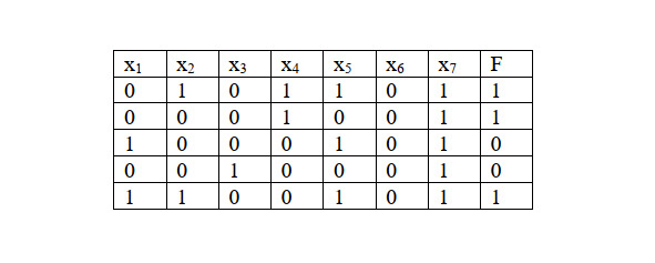 Для функции F известен фрагмент таблицы истинности, представленный ниже. Определите, какое максимальное количество единиц может быть в столбце F полной таблицы истинности, если известно, что при значении x4 = 1 значение функции равно 1.