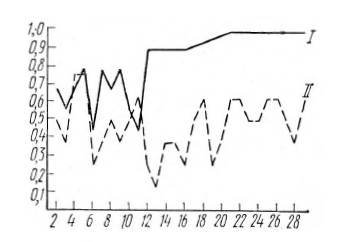 По результатам опыта испытуемые разбились на две группы: половина испытуемых (9 человек) с 10—20-й пробы (в среднем с 14-й пробы) начинала называть только плюс, т. е. тот знак, который постоянно называл экспериментатор. До 10-20-й пробы число плюсов и минусов в ответах испытуемых было примерно одинаковым, у двух испытуемых плюсов было немного больше (на 4–5 знаков). Вторая группа испытуемых полностью переходила на плюс с 22—70-й пробы, в среднем по восьми испытуемым с 39-й пробы. Четверо испытуемых этой группы с 5-й по 30-ю пробу называли большее число минусов (отсутствующий в последовательности экспериментатора знак), причем эти испытуемые назвали подряд 12–19 минусов, тогда как при вероятности сигналов P1 = Р2=0,5 эти испытуемые называли подряд не более 5 одинаковых знаков (рисунок 10).