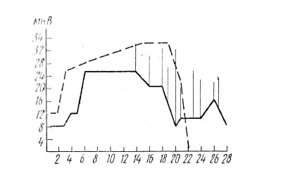 Рис. 9. Изменение амплитуды импульсов на ЭМГ в серии В у испытуемого Л. А.