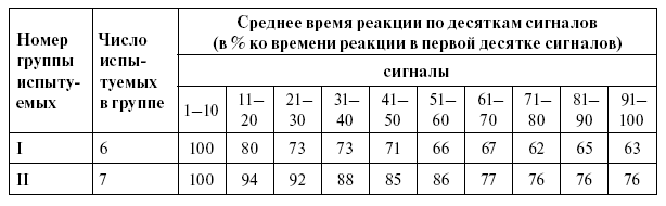 Из таблицы 2 видно, что у одной группы испытуемых (6 человек) время реакции изменяется довольно быстро. При 11-20-м сигналах время реакции у этой группы испытуемых уменьшилось на 20 %, а при 51-60-м сигналах время реакции составляло 66 % от времени реакции на первые 10 сигналов. К концу опыта у испытуемых этой группы время реакции достигало времени простой двигательной реакции или было очень близко к нему. У второй группы испытуемых (7 человек) время реакции изменялось значительно медленнее. При 11-20-м сигналах время реакции уменьшилось в среднем на 6 %, а при 51-60-м сигналах – составило 86 % от времени реакции на первые 10 сигналов. У одного испытуемого из этой группы время реакции на 11-30-й сигналы составляло 103 % по сравнению со временем реакции на первые десять сигналов.