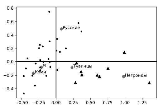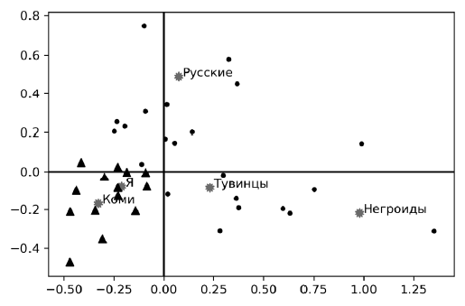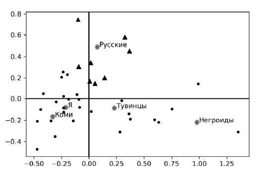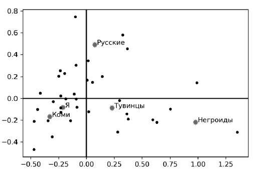 При обработке данных, описываемых в данном параграфе, анализировались расстояния между уровнями переменной «Этнос», а также характер группировки уровней переменной «Характеристика» относительно уровней переменной «Этнос». Для оценки взаимосвязи уровней переменной «Этнос» с уровнями переменной «Характеристика» использовалось косинусное расстояние между соответствующими отображениями точек в маломерном пространстве, полученном после выделения главных компонент.