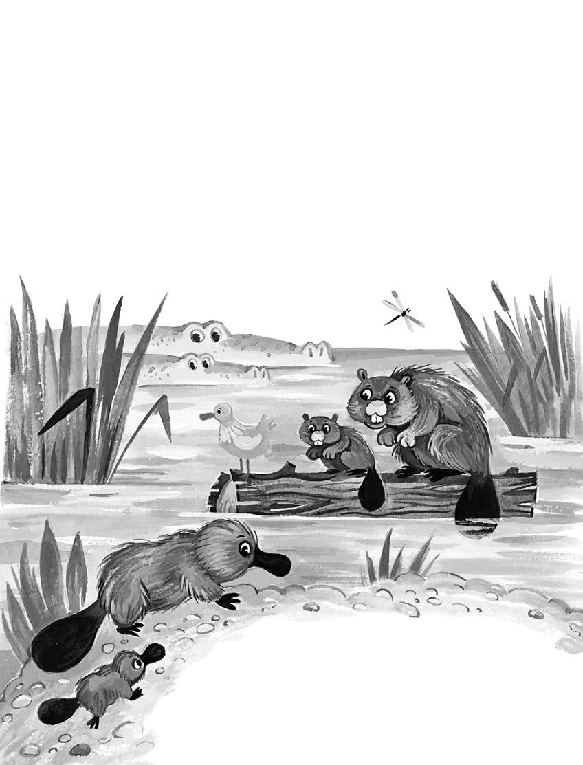 Малыш сел у воды и задумался: «Кто же я такой? Не утка, не бобр, не крокодил». И вдруг в глубине он увидел кого-то, кто тоже плакал. И у этого кого-то был клюв, как у утки, шерсть, как у зверя, хвост, как у бобра, а лапы, как у крокодила.