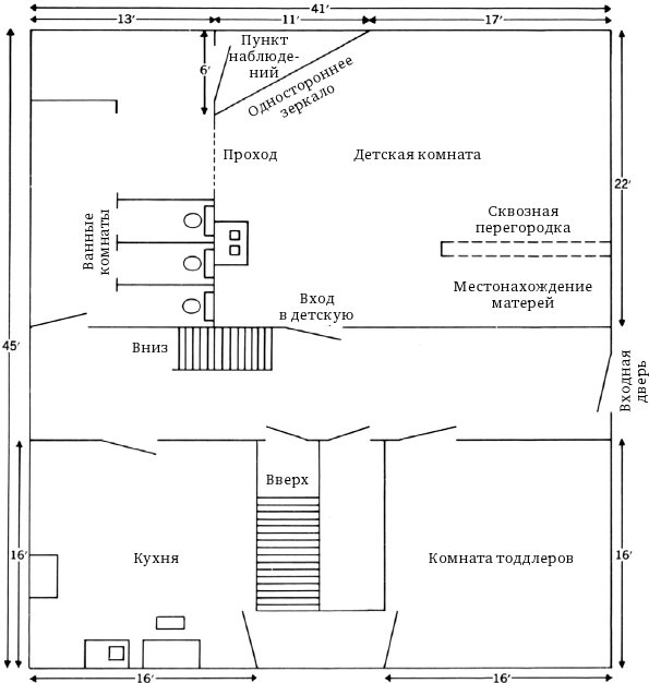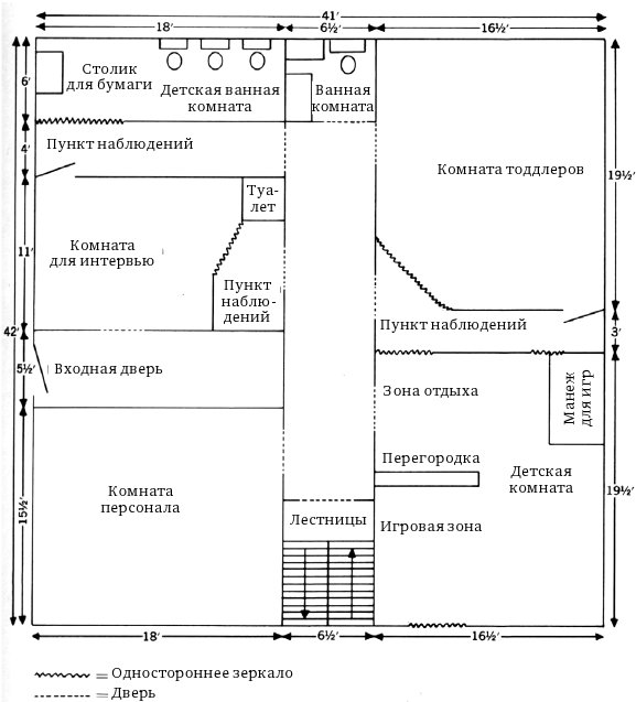 Эта глава описывает физический сеттинг нашего исследования, в особенности возможности, которые он предоставлял для наблюдения явлений, связанных с процессом сепарации-индивидуации. В ней вы также найдете некоторый обзор преобразований первоначальной планировки. Краткое перечисление разнообразных данных, полученных нами, а также обсуждение некоторых связанных с ними вопросов представлено в приложении А. В приложениях также содержится: 1) обсуждение метода, приводятся обоснования нашего подхода к анализу данных; 2) краткий обзор некоторых промежуточных попыток формального сбора данных и количественного анализа, который, способствуя развитию более ясного стиля наших описаний, тем не менее не увенчался успехом, поскольку оказался либо слишком узконаправленным, неспособным охватить процессы развития у детей, либо чрезмерно формализованным, либо и то и другое вместе; и 3) рассмотрение каждого из трех наших более поздних подходов к сбору данных (ориентирующие вопросы, наблюдение по зонам исходя из наших психоаналитически заданных рамок установления взаимосвязей, построение формулировок относительно ранних образований характера как производных процесса сепарации-индивидуации).