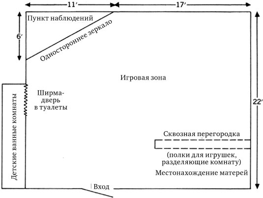 Мы хотели создать ситуацию, в которой можно было бы наблюдать спонтанные каждодневные взаимоотношения матери и ребенка в естественной обстановке, и нам это удалось. В игровой комнате была небольшая зона, отведенная под гостиную для матерей, где они могли болтать, пить кофе или читать и откуда у них был обзор и полный доступ к детям. Также там была другая, гораздо большая зона, в которой находилось много привлекательных и красочных игрушек, и дети при первой возможности стремились начать свободно перемещаться между зоной игрушек, местом, где обычно находились матери, и другими частями комнаты. Сепарация матери и ребенка не была полной в том, что касается пространственного обустройства комнаты; это не было похоже на ситуацию в школе или детском саду, где мать на некоторое время перекладывает заботу о своем ребенке на плечи воспитателя или учителя. Это больше походило на обстановку на уличной игровой площадке, где дети играют, где им захочется, в то время как матери сидят на скамейках и разговаривают, при этом дети полностью находятся в их поле зрения и имеют возможность обратиться к матери, что бы им ни потребовалось. Рисунок 1 иллюстрирует первоначальный сеттинг материнско-детской комнаты11.