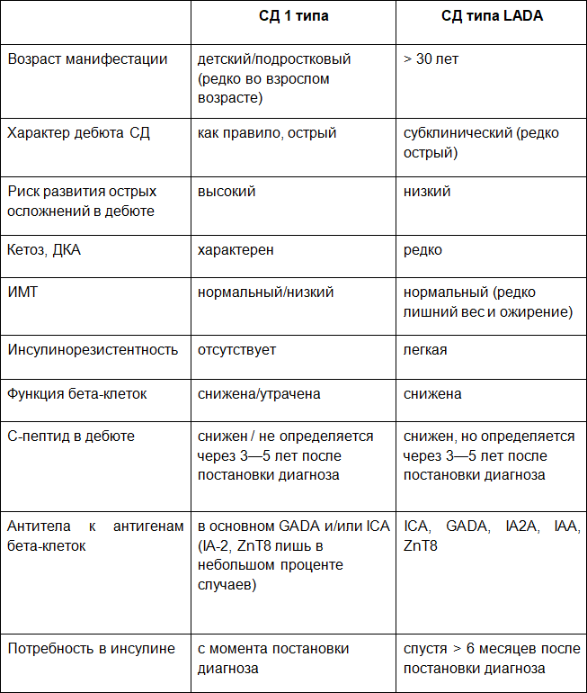 Диабет типа LADA (латентный аутоиммунный диабет взрослых) классифицируется как подтип СД 1 типа и занимает промежуточное место между классическим СД 1 типа и СД 2 типа. Клиническая картина LADA напоминает таковую у больных СД 2 типа: характерен субклинический дебют заболевания, медленное прогрессирование симптомов, не наблюдается склонность к ДКА, однако для пациентов с LADA не характерно ожирение. Медленное прогрессирование деструкции β-клеток объясняет удовлетворительную компенсацию углеводного обмена при приеме ПССП в первые годы заболевания. Лабораторные исследования выявляют наличие как минимум одного вида антител к островковому аппарату ПЖ (чаще всего GAD и ICA), а также сниженный, но определяемый уровень С-пептида как в дебюте заболевания, так и через 3–5 лет после постановки диагноза, в связи с чем потребность в инсулине появляется не ранее чем через 6 месяцев после манифестации [19, 20].