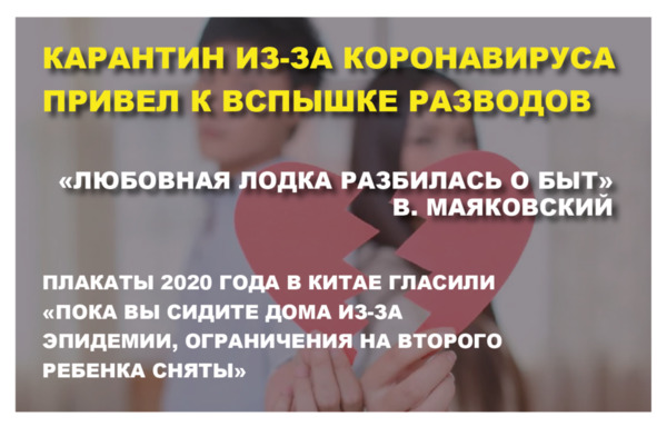 В городке Дачжоу, провинция Сычуань, за месяц более 300 пар подали на развод. В городе Сиань, провинция Шэньси, за один только день поступило 14 заявок на расторжение брака, что превысило возможный суточный лимит, сотрудники просто не смогли принять всех желающих. Это невиданные для Китая цифры. У загсов выстраиваются очереди людей в масках, которые, уткнувшись в телефоны, демонстративно не замечают друг друга. Как тут не вспомнить Владимира Владимировича Маяковского с его сакраментальным: «Любовная лодка разбилась о быт».