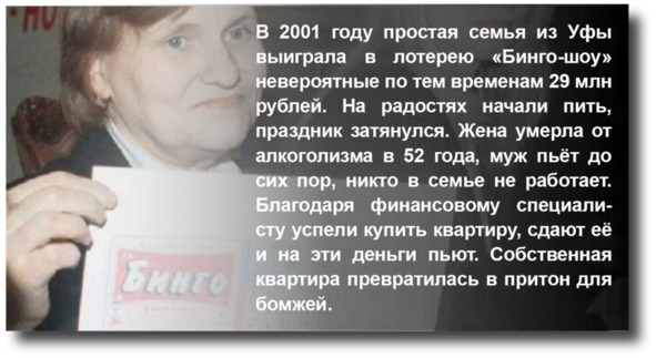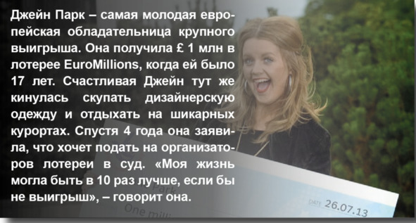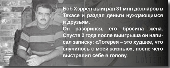 – 70% американцев, выигравших в лотерею очень крупные суммы, через 7 лет полностью разорялись, погибали или теряли своих близких.