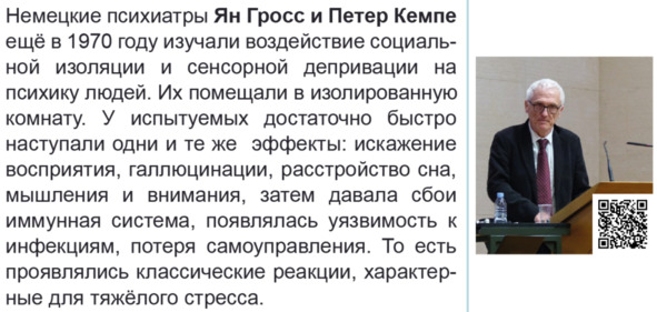 Какой вывод можно сделать из этих исследований? Большинство животных и подавляющее большинство людей буквально физиологически предназначены для жизни в «общежитии», рядом со своими шумными соседями. Люди, по разным причинам выключенные из социума, оказываются в ситуации социальной депривации, которая вначале переживается ими как дискомфорт от одиночества из-за сложностей в удовлетворении базовых социальнопсихологических потребностей (в принадлежности, любви, дружбе, привязанности, поддержке, помощи), а в итоге, в самых запущенных случаях приводит к деградации личности.
