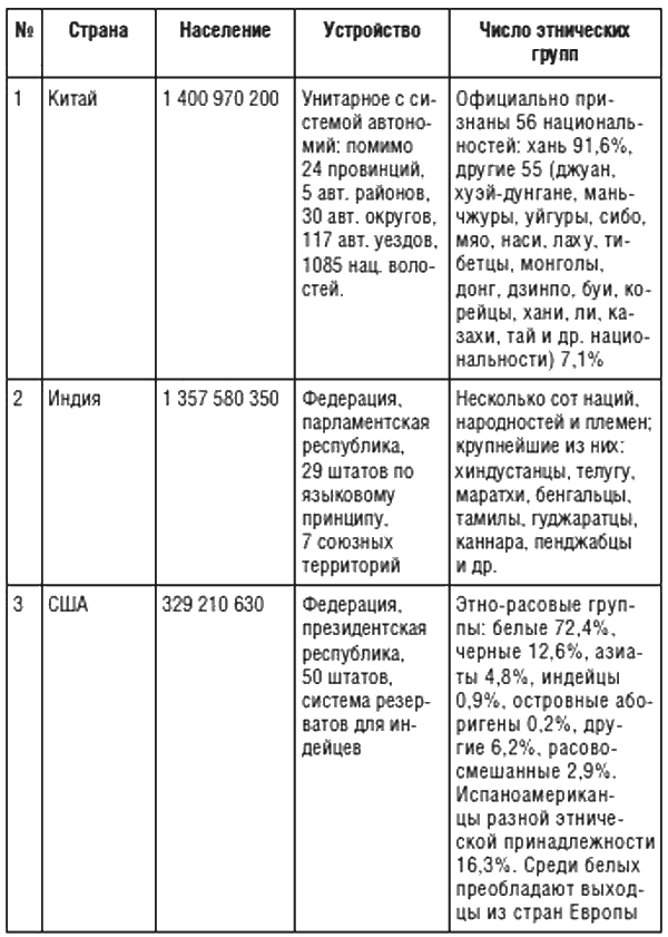 Государственное устройство и этнический состав крупных стран мира (на 2020 г.)