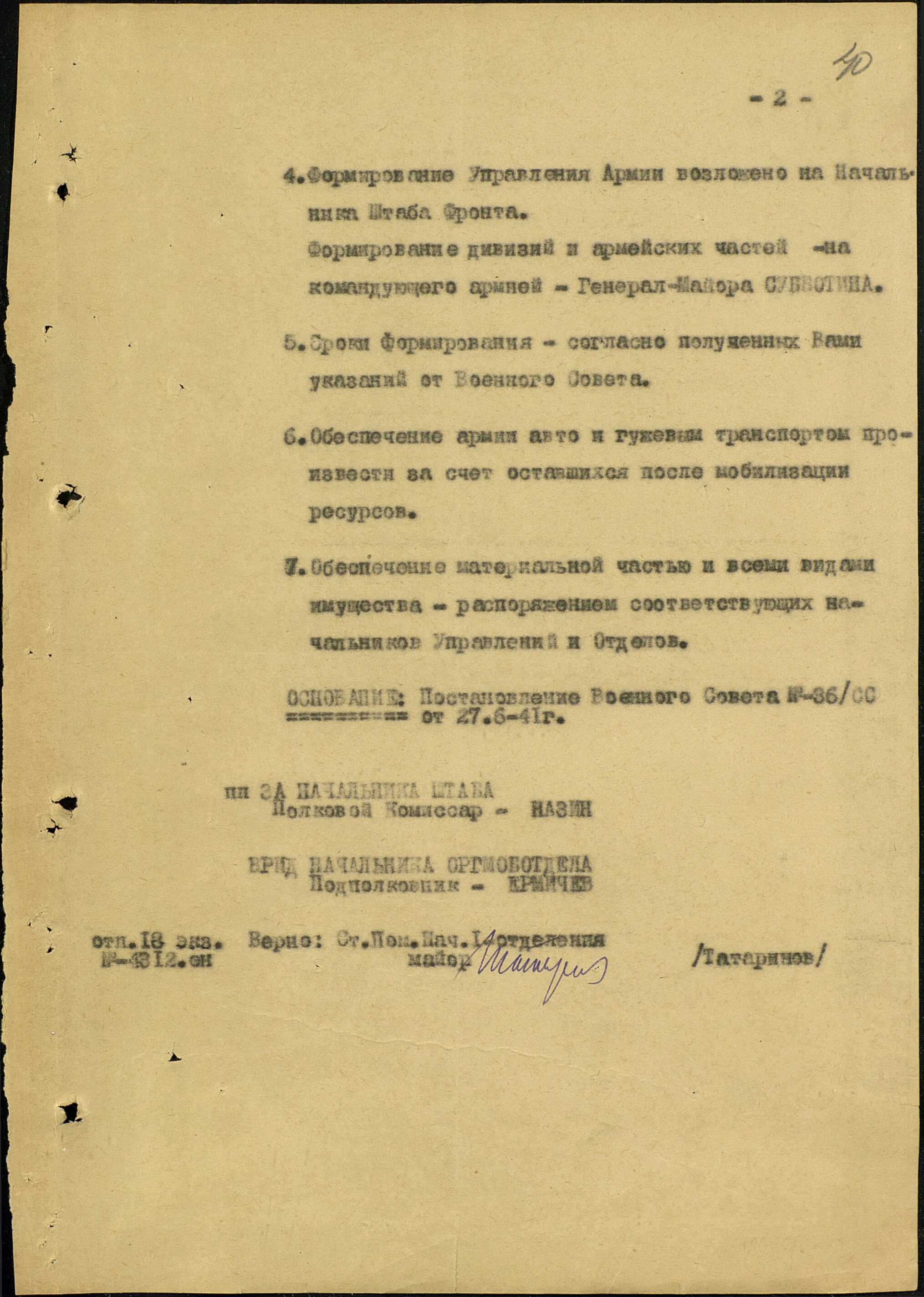 Штаб дивизии: ул. Правды, д.20, куда он должен явиться к 18 часам. Фамилию и должность выделенного сообщить оперативному дежурному по полку к 23 ч. 12.07.41.