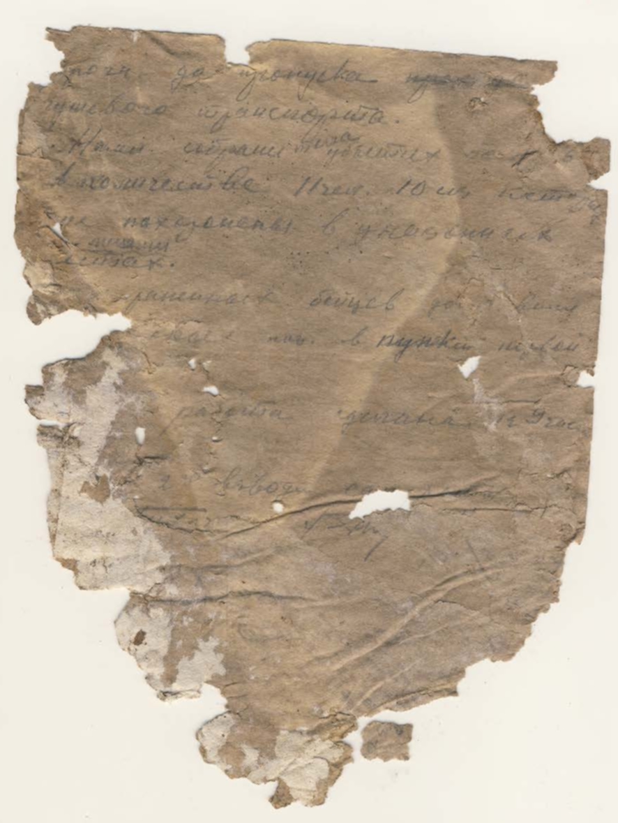 На основании личной договоренности направляю вам бойца т. Пр(охорова) – ? В.М., в качестве писаря, взамен которого вы обещали дать … бойцов кроме задерж… политрука нашей … …това какового … обратно сегодня