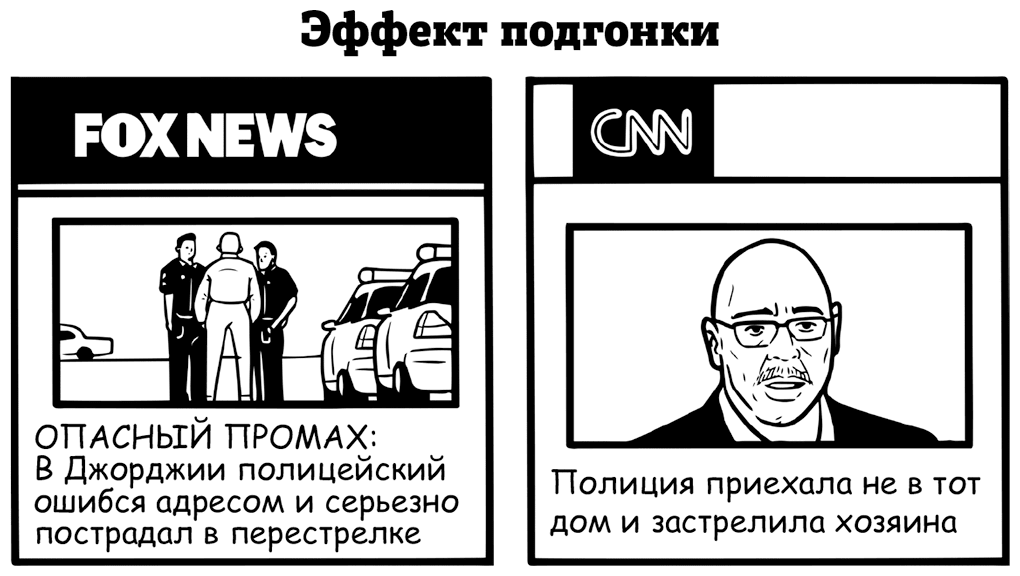 Если вы читаете новости в интернете, то вы прекрасно представляете себе механизмы подгонки. Авторы заголовков занимаются подгонкой информации, влияя на смысл, извлекаемый читателями из истории. 31 августа 2015 года трое полицейских получили сообщение об ограблении из службы 911. К сожалению, звонящий не уточнил адрес, и полицейские приехали не в тот дом. Обнаружив, что задняя дверь не заперта, они вошли внутрь и вспугнули собаку. Раздались выстрелы. Стрелял полицейский, а в результате пострадали его напарник собака и хозяин дома. Люди выжили. Однако два заголовка представляют этот инцидент совершенно в разном свете.