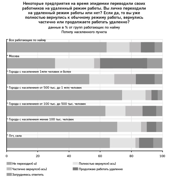 К началу июля 15 % наемных работников вернулись на привычные рабочие места полностью, 7 % – частично (на бюджетных предприятиях немногим больше, чем на частных: 9 и 6 % соответственно). Все еще продолжают трудиться из дома 9 % наемных работников. Среди москвичей и лиц с высшим образованием этот показатель самый высокий: 30 и 15 % работающих по найму соответственно.