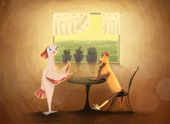 Итак, два друга направились в кафе, которое называлось «Кулинарная лавка Ли». Это место носило имя их давней подруги, курочки Ли. Она была самой молодой деловой курочкой в городке, и петушки спешили поддержать ее.