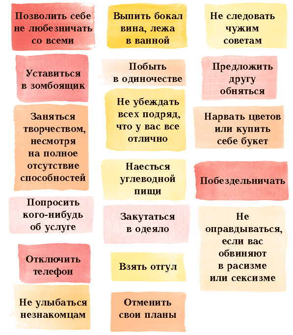 Порадуйте свое тело. Вычеркните хотя бы четыре пункта из списка, прежде чем пробовать что-то еще, – велика вероятность, что часть неприятных ощущений тоже исчезнет. Ваше тело требует, чтобы вы относились к нему с уважением.